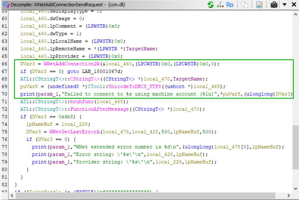 Going further, after decompiling the dynamic-link library (DLL) used for client push installation (i.e., ccm.dll) using Ghidra, we confirmed that during the client push installation process the WNetAddConnection2 Windows API call is actively used. To find this specific usage in Ghidra, we used a string search for the error message shown in the CMTrace logs to identify the correct location of the target instructions.