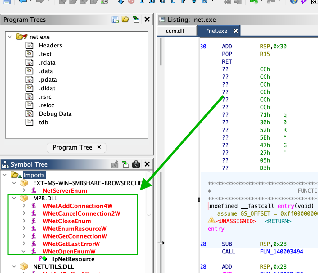 The last piece in the puzzle came from examining the imports of the net.exe binary.