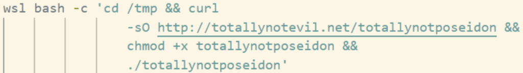 OK. Quick aside. This isn’t actually how I do it; that example is as egregious as possible for demonstration. In reality, you can write your payload straight to the WSL file system via the $WSL share with a benign name and kick it off. You can also obfuscate running multiple commands at once by writing a shell script to disk and then just calling WSL.exe to execute that. But the point stands, a random process spawning WSL.exe is sketchy… or so I thought!