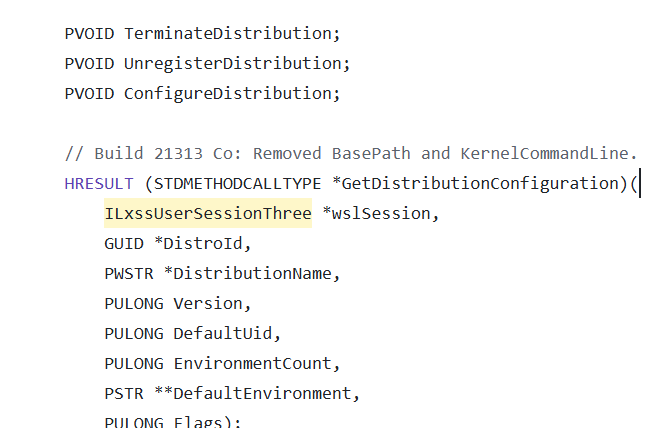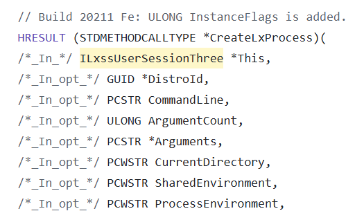 The answer to why Microsoft developers just spawn out to WSL.exe from the DLL became apparent pretty quickly. Adam found an IDL for the service we were interested in (i.e., wslservice.idl) on GitHub since WSL is now open sourced. Perfect! This will also be a piece of cake: we can just use MIDL.EXE to create the appropriate header for us from the IDL file and use that to call our function of interest (i.e., CreateLxProcess) via COM.