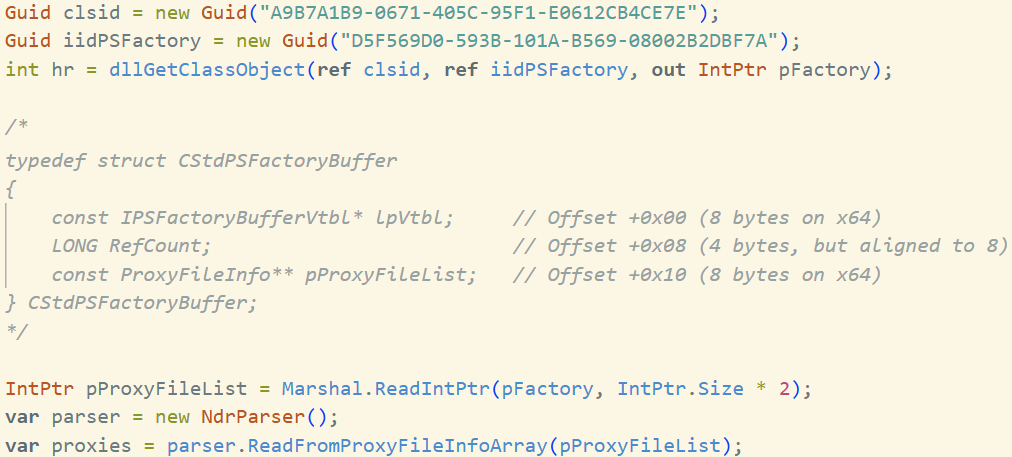 Why is the proxy stub DLL useful? Because it contains a data structure called the ProxyFileList which is generated via MIDL, and it contains all the metadata needed to marshal and unmarshal COM interface calls (which we now know is this DLL’s job). This contains enough data to recreate an IDL file that we can then use with MIDL.