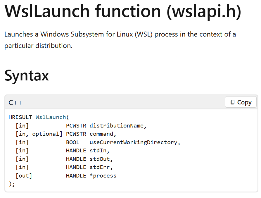 The BOF seemed suspiciously straightforward: there is an API function, WslLaunch, which is exposed by wslapi.h/WslApi.dll that does exactly what we wanted. You just give it a WSL instance and a command, and it’ll execute the command you want on that distro. Easy as pie!
