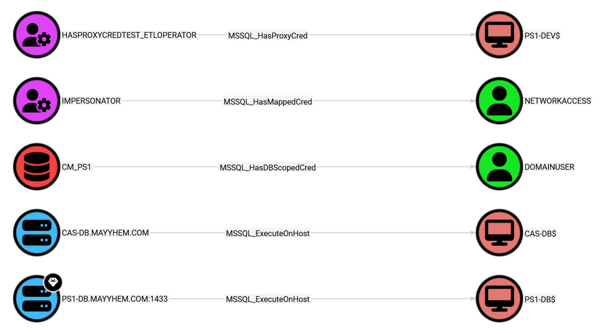 MATCH p = ()-[:MSSQL_ExecuteOnHost|MSSQL_HasDBScopedCred|MSSQL_HasMappedCred|MSSQL_HasProxyCred]->(:Base) RETURN p