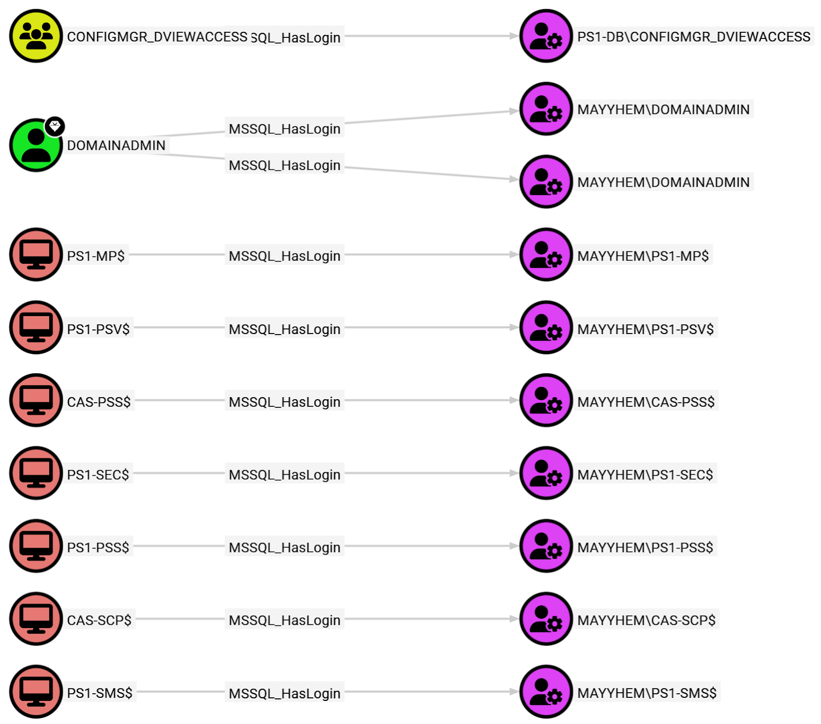 This query displays all domain principals (i.e., Users, Computers, and Groups) that are mapped to an MSSQL server login: