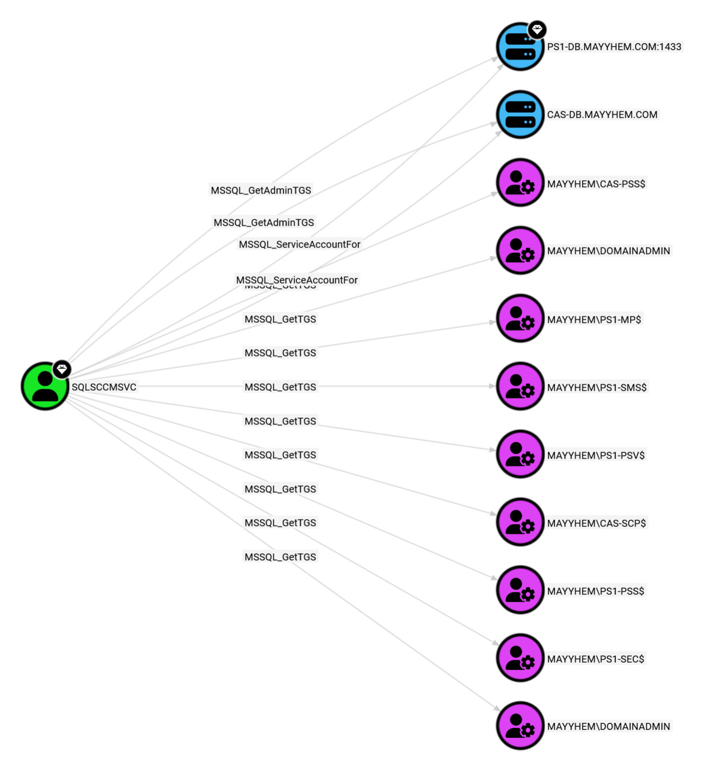 MATCH p = (:Base)-[:MSSQL_GetTGS|MSSQL_GetAdminTGS|MSSQL_ServiceAccountFor]->() RETURN p