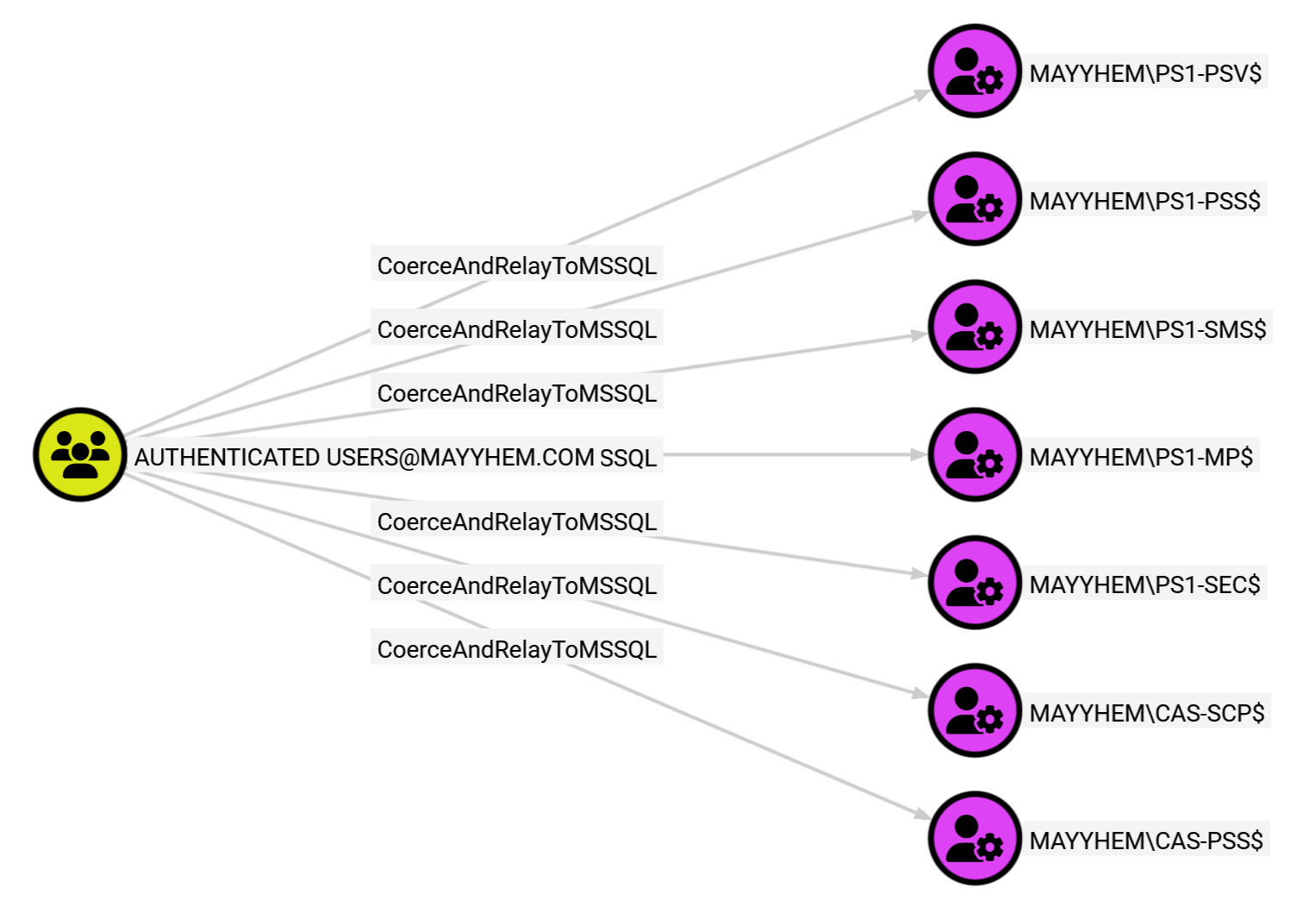 This query displays when the AUTHENTICATED USERS group can coerce authentication from a domain computer account that has an MSSQL server login due to lack of EPA requirements on the server: