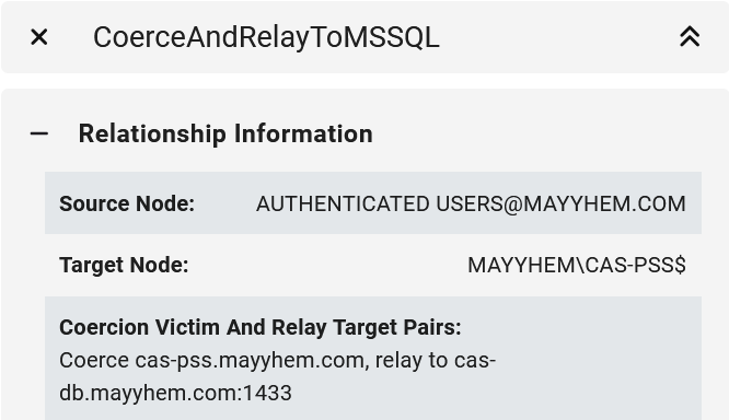 If we open the entity panel for any of the CoerceAndRelayToMSSQL edges, we can see the specific systems to coerce authentication from and the MSSQL server hostname and port to relay to.