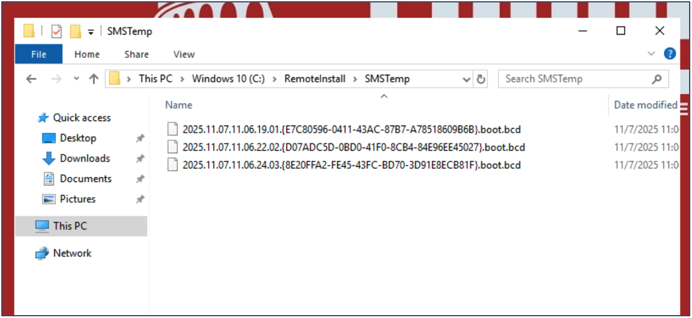 In large environments where multiple Distribution Points are deployed, defenders can designate one of the Distribution Points as a PXE media serving file share as a deception solution for the most realistic approach. Distribution Points serving PXE media files will typically have a REMINST (RemoteInstall) directory and a SMSTemp share accessible for the Authenticated Users group to “Read.”