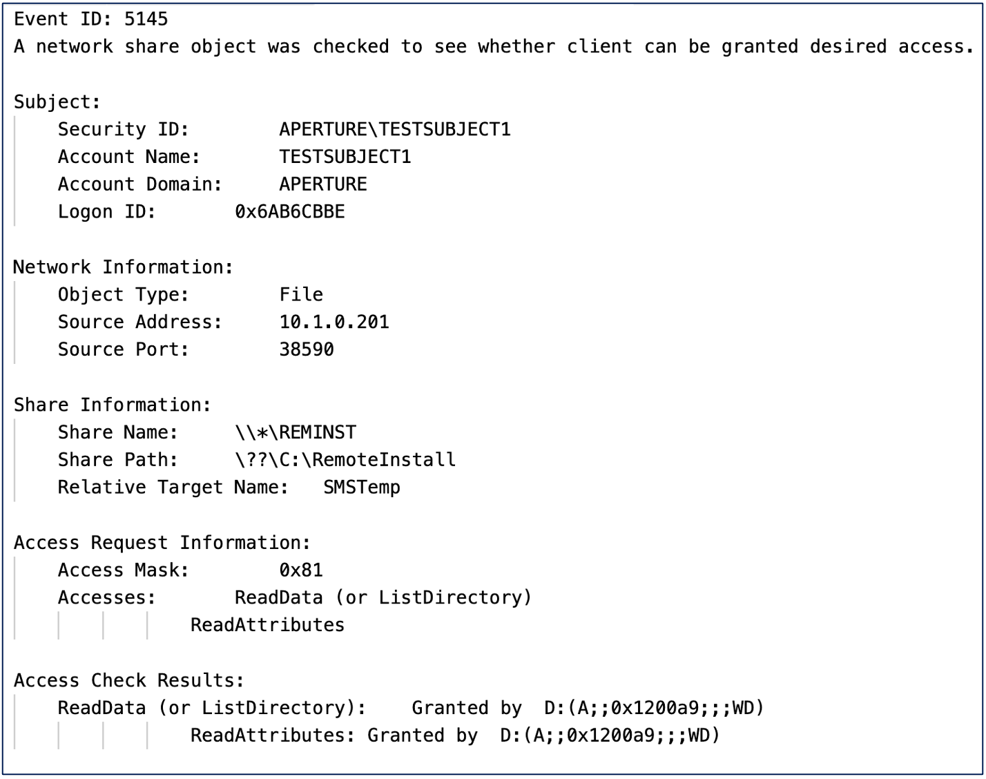 We suggest “Detailed File Share” auditing over “File Share” auditing even though the former is well-known for being overly verbose, due to the fact that the “Detailed File Share” auditing generates an Event ID (EID) 5145 (i.e., “A network share object was checked to see whether client can be granted access”) which provides valuable details such as the specific file that was accessed, the access check results, and even the user that committed the access attempt. Additionally, since this member server is used as a deception solution, the volume of logs accessing the SMSTemp share path should be relatively low. Below is an example of the “Detailed File Share” auditing Event ID 5145 during an access attempt of PXEThief: