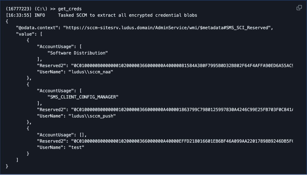 I’m a big believer in “trust but verify” and, if you’re like me, you’ll want to do the same thing. Garrett Foster’s tool, SCCMHunter, has an admin module you can use to run the get_creds command to validate the password set for the canary NAA service account in the SC_UserAccount table.