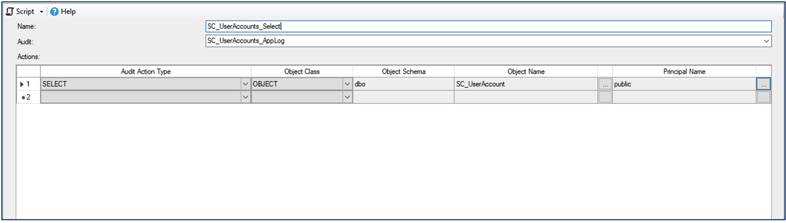 - Right-click SC_UserAccounts_Select and select “Enable Database Audit Specification…”