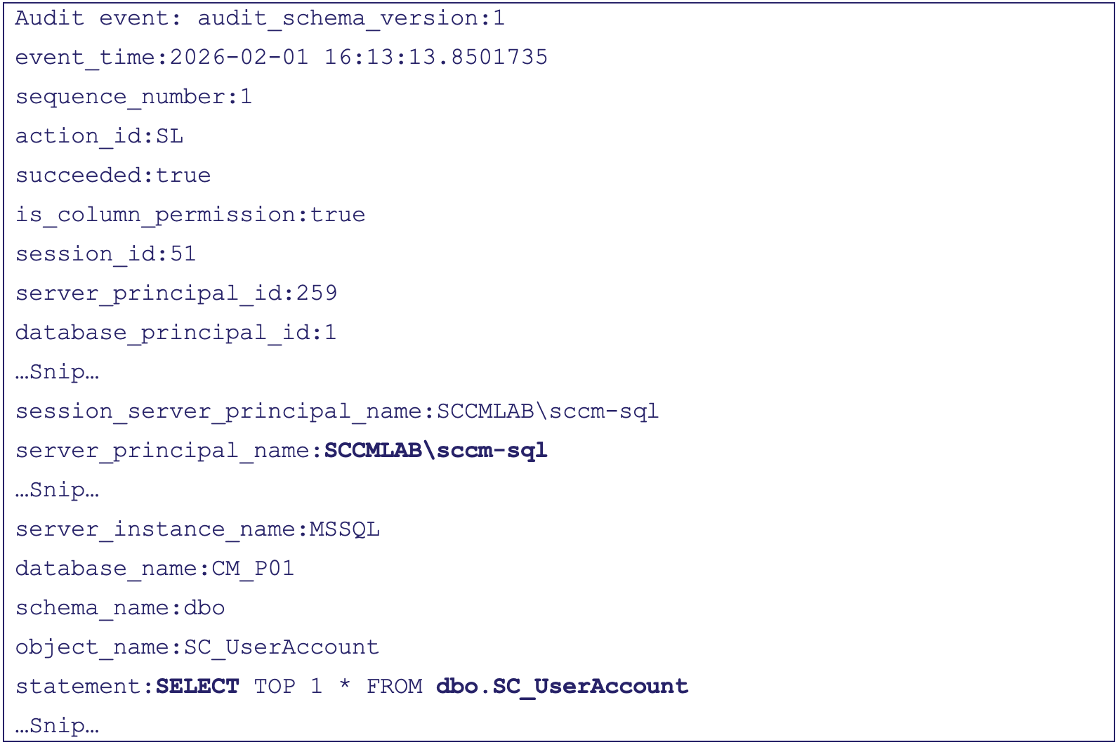 The final step in creating an effective deception solution is to ensure the deception solution is reliably audited. Defenders can audit the NAA canary account upon enumeration and credential abuse by malicious actors by centralizing the previously mentioned SACL events for the NAA canary account (e.g., E ID 4662 [i.e., “An operation was performed on an object”]) and the Detailed File Share audit of the canary Distribution Point (e.g., EID 5145 [i.e., “A network share object was checked to see whether client can be granted desired access”]). However, we need some way to determine when an adversary attempts to enumerate the credentials of the NAA account from the SC_UserAccount table on the site MSSQL site database server. For that defensive technique, we can leverage a custom SQL audit.