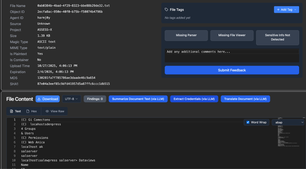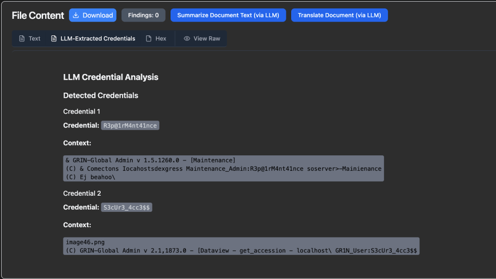 While we run Nosey Parker scans against all plaintext files and files that can have plaintext extracted, generic password/credential detection is a tough problem to solve in the general case. This task is a great application for an LLM. For any plaintext file or file that has extracted plaintext, if LLM functionality is enabled, an Extract Credentials (via LLM) will appear: