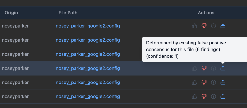 As findings come in, the findings validator will try to assess if a finding fits one of these three categories, taking into account the finding details as well as the originating file path. If the module triages a finding, a small little robot icon will appear next to the triaged value. You can filter these with All Triage Sources / Automated Triage Sources / Human Triage Sources. If a human triages a finding as a different value, that will override the automated triage value. Mousing over the robot icon will give a brief explanation for the decision and a confidence score: