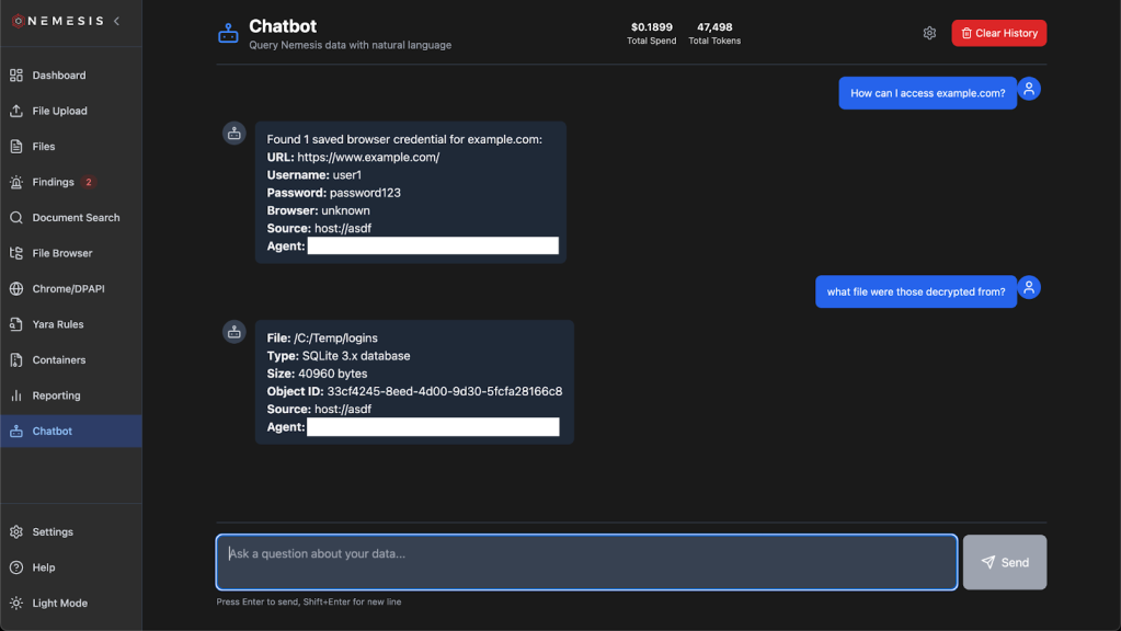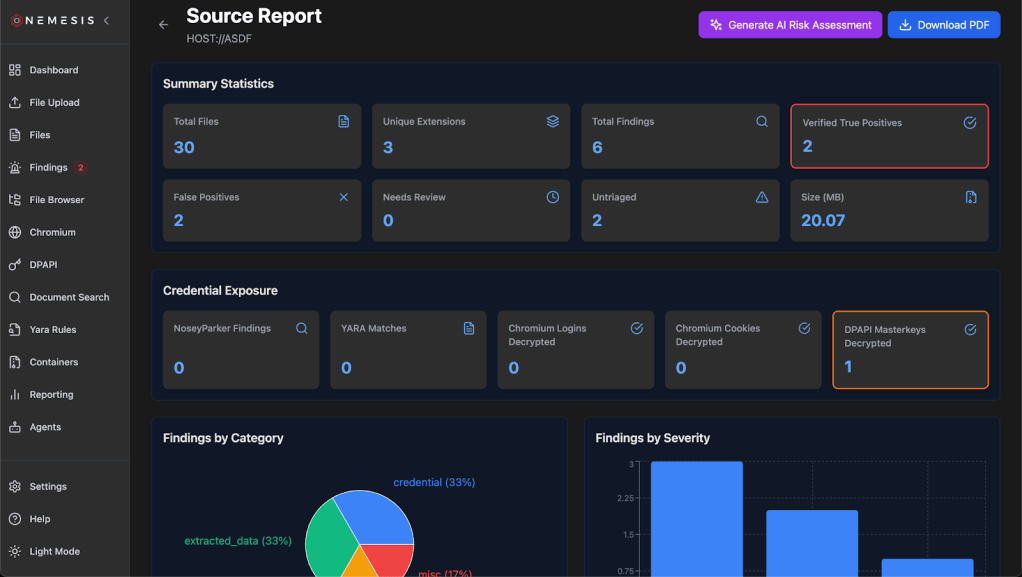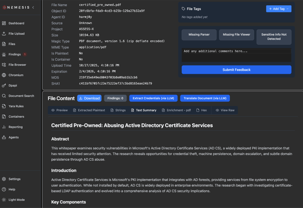 One of the meta-goals with this development cycle was to build functionality into Nemesis that would make it useful from a defensive perspective. Specifically, if a system is compromised or we get access to exfiltrated data, we want to triage all the data and determine the âriskâ it represents, i.e., what kind of data does an attacker have access to and what additional access could the attacker gain using the data (e.g., credentials or lateral movement opportunities). Nemesis 2.2 can help provide answers to that, and it provides collaborative analysis workflows (as a team or with AI) to help with the triage. We want to thank the United Kingdomâs National Cyber Security Centre (NCSC) for helping to fund this development effort that produced all this great new defensive functionality!