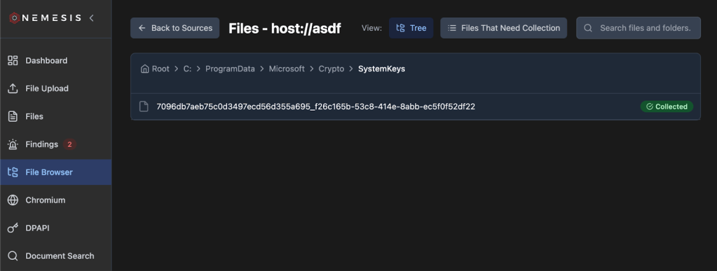 This lets us group files together that come from the same source/host, something thatâs necessary for the more complex DPAPI file functionality described in the previous section. It also lets us build some neat things like a virtual File Browser (left nav bar):