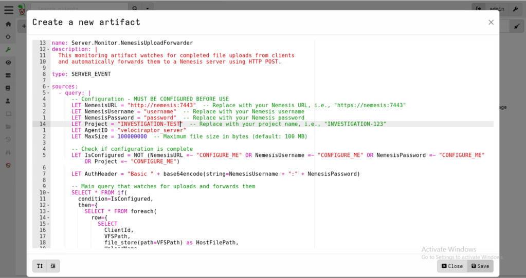 Some of you may be familiar with the Velociraptor forensic project (some attackers certainly are!). We wanted to build a âcollectorâ for Velociraptor that let us send files acquired via Velociraptor to a Nemesis instance and, luckily for us, Velociraptor has an API! We started going down the route of building a collector similar to our cli implementations for Mythic and Stage1, until we found Velociraptorâs âServer Monitoringâ monitoring functionality that uses their VQL query language. Fortunately, thereâs a http_client function that lets us POST data, so the entire collector ends up being just 80 lines!