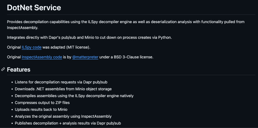 Similarly, the dotnet_service is no longer a web API that simply runs the InspectAssembly and ILSpy CLI tools. Instead, we integrated InspectAssemblyâs and ILSpyâs functionality into the dotnet_service and now all analysis happens in-process as each file is dequeued.