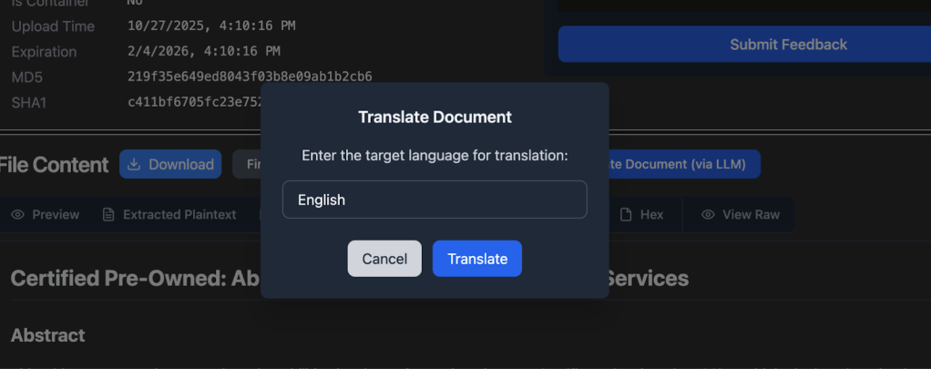 And almost the same as the summarizer, the Translator can be manually triggered for appropriate documents, but has a target language to translate the entire document to: