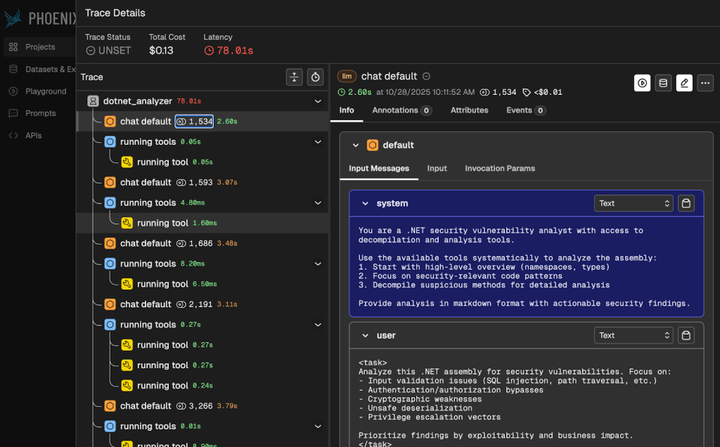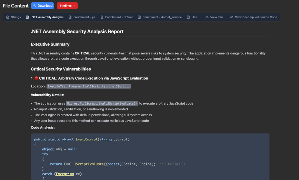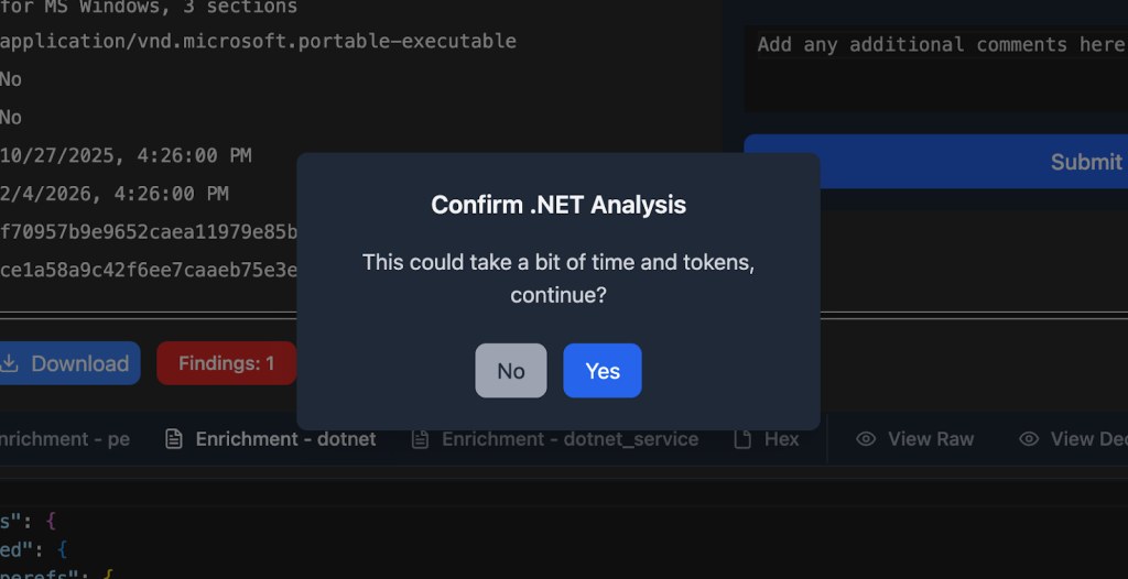 The awesome team at Dreadnode recently released a number of example agents on GitHub. One thatâs of particular interest to us is the dotnet_reversing agent, which we ported to our system. A button will appear for .NET assemblies, and will also warn you that this might take a bit of time and tokens depending on the assembly sizes (as multiple tools are used):