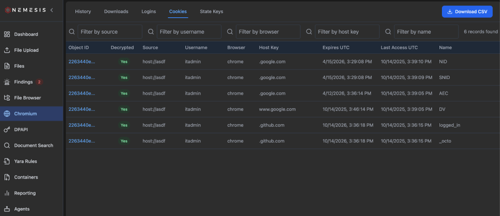 Luckily, Nemesis can now handle all of these files, assuming you can acquire them. And even better, the order of submission doesnât matter, as Nemesis will handle forward AND retroactive decryption of these sets of files, allowing you to get to those delicious, delicious cookies and logins: