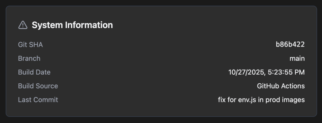 When troubleshooting, it really helps to know exactly which version of the codebase someone is running. Since we know have development and production versions of Nemesis containers, with local and GitHub action build sources, we now have a version tracker in the main frontend UI under the Settings page on the left: