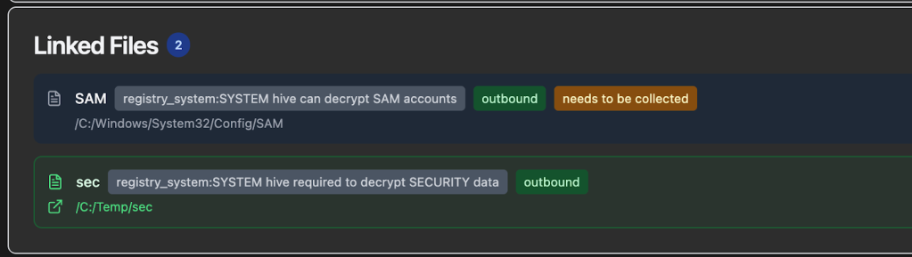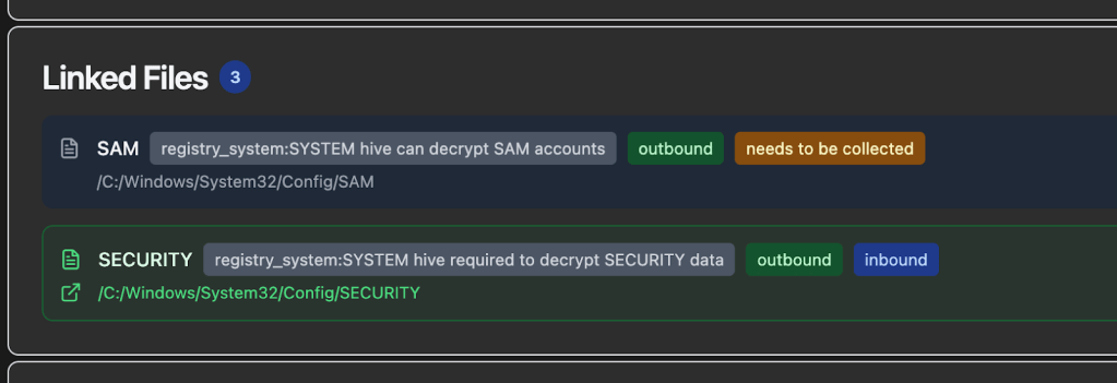 How does this system work? Well, if we have files that imply the location of other files, like a SYSTEM DPAPI masterkey file indicating a SYSTEM/SECURITY hive would be needed, Nemesis now has a file linking system. Links for files to download, or files that were already downloaded and related, are displayed at the bottom of the file details page (we will as the previous file browser display):