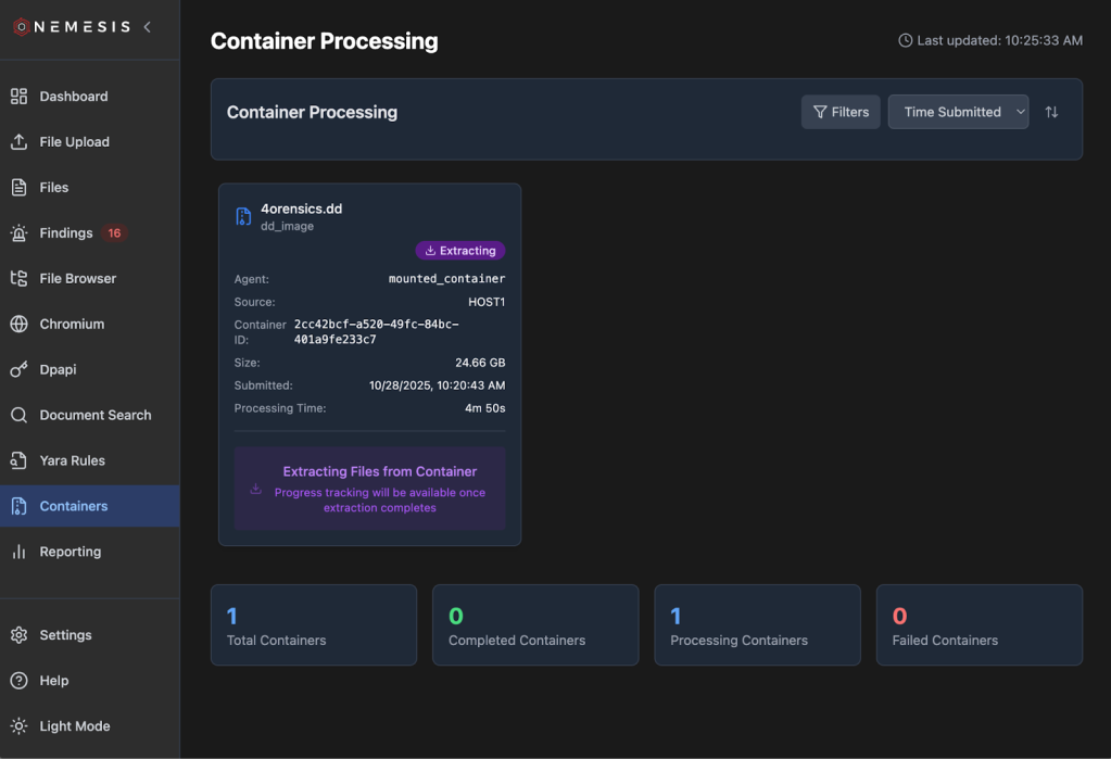 Once the processing code finishes extracting all of the files from the container and submits everything to the Nemesis queue, the container status will be properly updated: