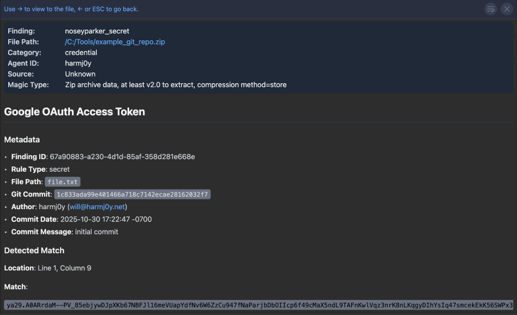 As mentioned previously in the Performance section, Nemesis 2.2 changed Nosey Parker to run as a standalone Rust application. In addition, Nemesis can now extract and scan ZIP containers (including .git commit history) if the DECOMPRESS_ZIPS variable is set to true (which it is by default in the compose.yaml). This lets you scan git repos or containers of files for Nosey Parker results without having to extract and process every file in the container: