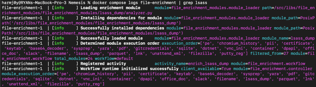 With the module present, all we have to do is start up Nemesis in development mode with ./tools/nemesis-ctl.sh start dev . This will build all of the images locally, and if we change our file enrichment module code it will detect and relaunch the file-enrichment service with the new module code. Checking the Docker logs for the file-enrichment service, we can see that the uv dependencies for the module are installed, and the module loads up successfully: