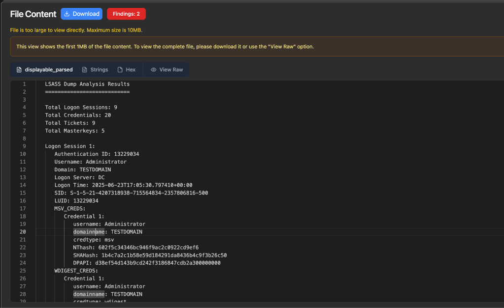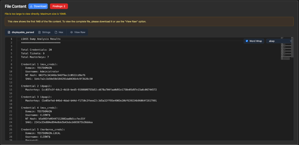 Now let’s upload our sample lsass.dmp and see if everything works: