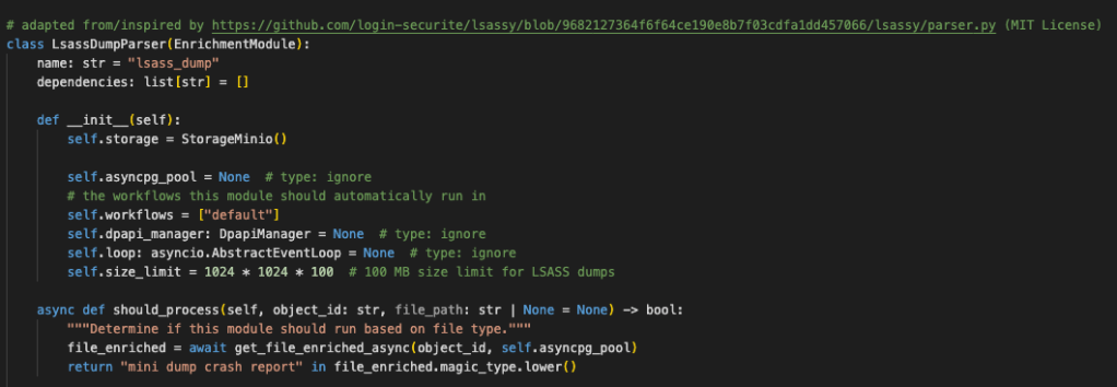 Let’s start with constructing a new enrichment module for something a number of people have requested: parsing LSASS memory dumps using the awesome pypykatz project by @SkelSec. This is present in our new 2.2 release, but I wanted to walk you through the process for creation.