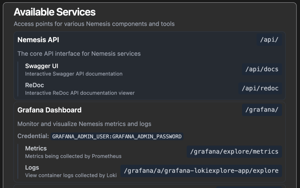 Before we write anything, we need to know how the API works. In a Nemesis instance, clicking on the “Help” link in the bottom left shows the current existing Nemesis services, including Swagger and ReDoc documentation for the complete Nemesis API:
