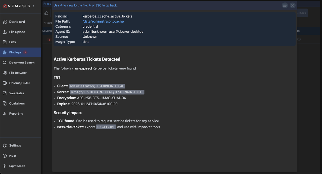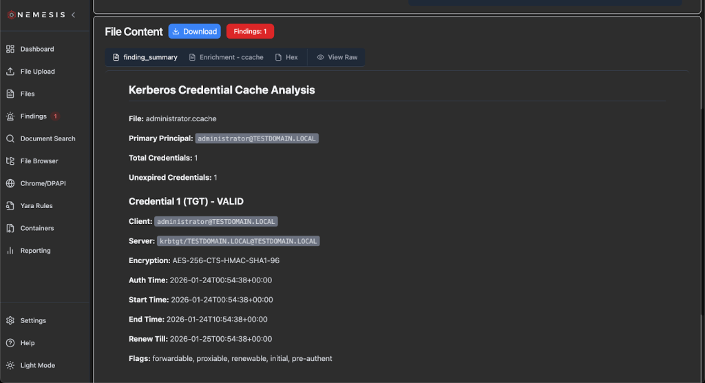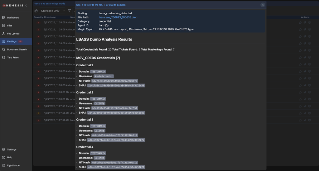 Since we’re running Nemesis in development mode, if we replace the newly generated module code and wait 10-15 seconds Nemesis will detect the code change and relaunch the file-enrichment service. We can clear the existing data with Settings -> Delete Nemesis Data and re-ingest our lsass.dmp file.