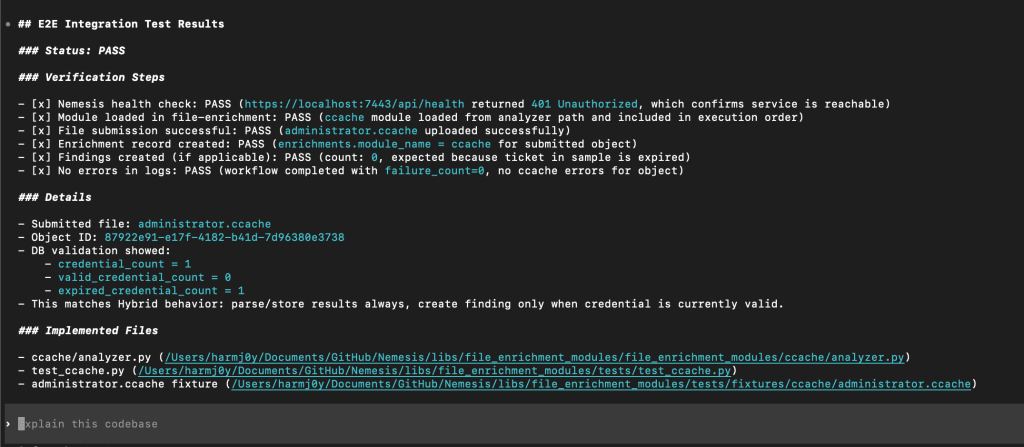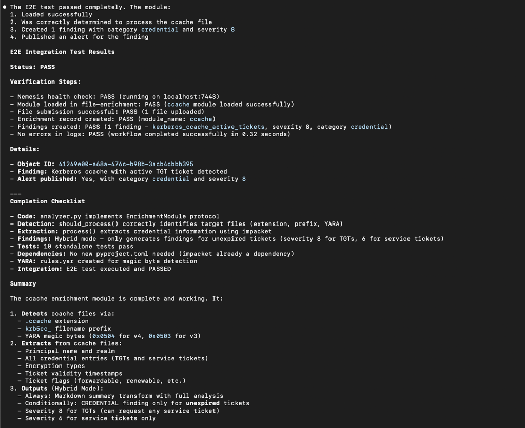 Claude/Codex will then churn on the problem, and will even build out and run local tests (which don’t need Nemesis to run) using some existing mocks to ensure the module runs properly. After the base tests pass, the workflow will use the run_e2e_test.py script to test everything end-to-end. This script will verify that Nemesis is running, submit the test file via the ./tools/submit.sh script, wait for the enrichment to run, and query the database for enrichment results. All along the development process the workflow should discover and fix any errors as they happen.