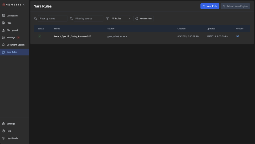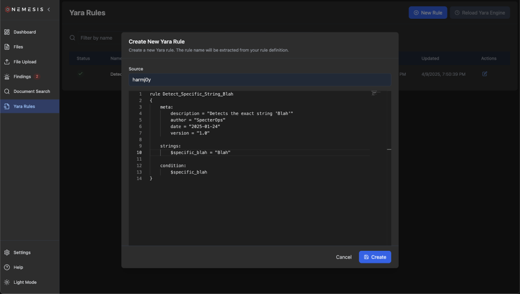 Nemesis has the ability to dynamically edit existing, and deploy new, Yara rules which are run against all files (including plaintext extracted from applicable files). These rules are stored in the PostgreSQL backend and dynamically loaded by the Yara file enrichment module which uses yara-x for performant scanning.