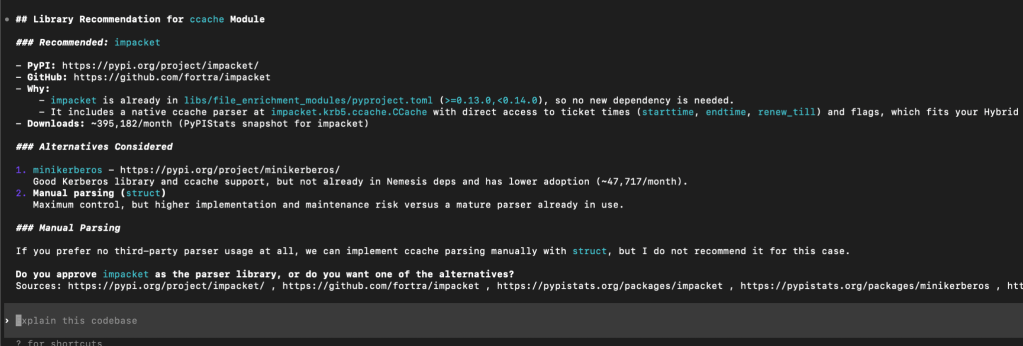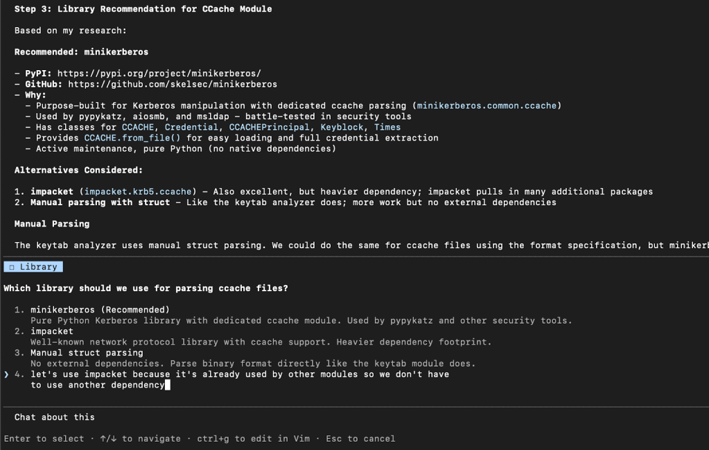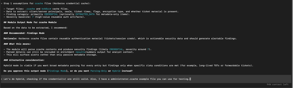 The next review gate is for you to confirm the exact library (if any) for the module to use for parsing. We’ve noticed that at times these systems can fixate on old libraries or ones that we know have issues, so we wanted to build in the chance to give feedback on this selection. For example in the following, we choose to NOT go with Claude’s default recommendation as we already make wide use of Impacket in various existing modules: