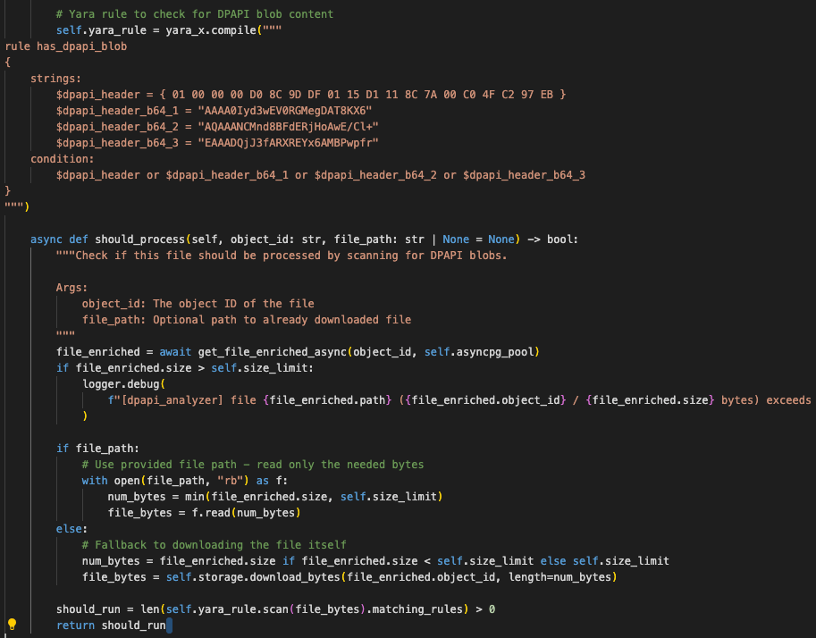 Alternatively, we can analyze some (or all) bytes from the file itself to determine if we should process. For example, in the dpapi analyzer, we use a defined Yara rule to scan for the presence of DPAPI blobs: