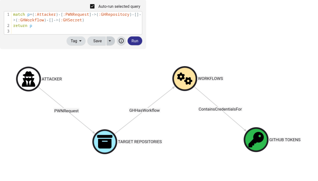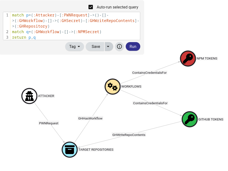 This graph shows an overview of the attack. The attacker targeted at least one repository susceptible to PWN request attacks. The infected packages ran on developer systems such as workstations or CI runners. The malware used various credential harvesting techniques to find credentials. This is depicted as “ContainsCredentialsFor” edges originating from the developer computer node to various types of secrets. I discussed this edge in a previous blog post. The credentials are then exfiltrated to a network of public repositories. At this point, anyone could access the exfiltrated credentials simply by viewing the contents of these public repositories.