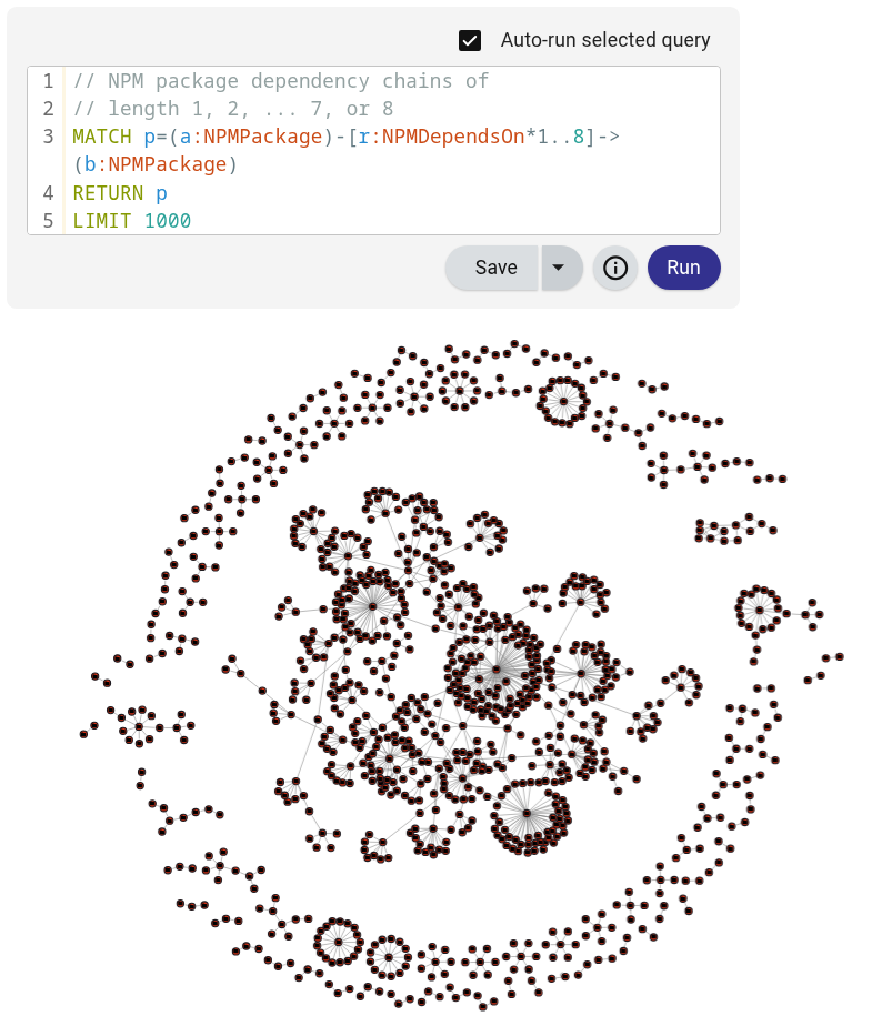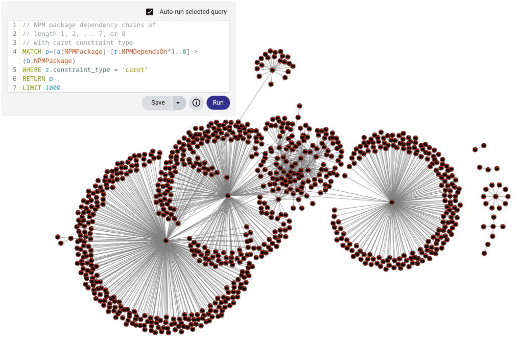 We can restrict our view to the edges that might be susceptible to attacks like Shai-Hulud by changing our cypher query to only return paths where the edges have the constraint_type equal to the ‘caret’ property. Updates to upstream packages propagate down the dependency tree structures to dependent packages.