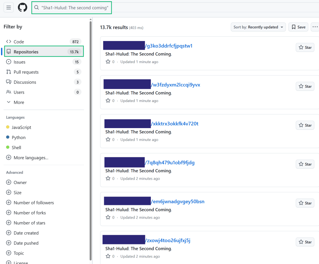 The worm captured other credentials as well. The credentials were exfiltrated to a network of public repositories on GitHub. This exfiltration was done by either creating a new repository using newly compromised GitHub tokens or by using previously compromised GitHub tokens. In the second case, previously compromised GitHub tokens were retrieved from the exfiltration network. In this way, a victim of this malware may have had their credentials exfiltrated to a repository they do not control. Each repository had a description of “Sha1-Hulud: The Second Coming.” On November 25, 2025, I searched GitHub for this string and took a screenshot to get a sense of the scale.