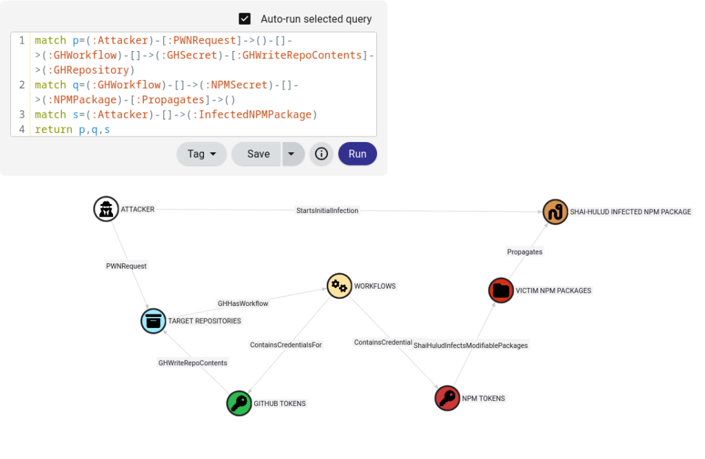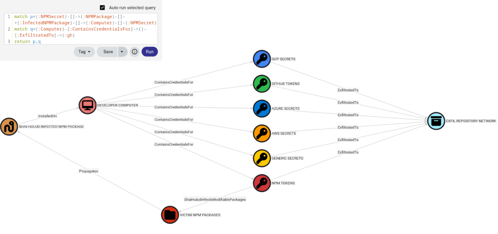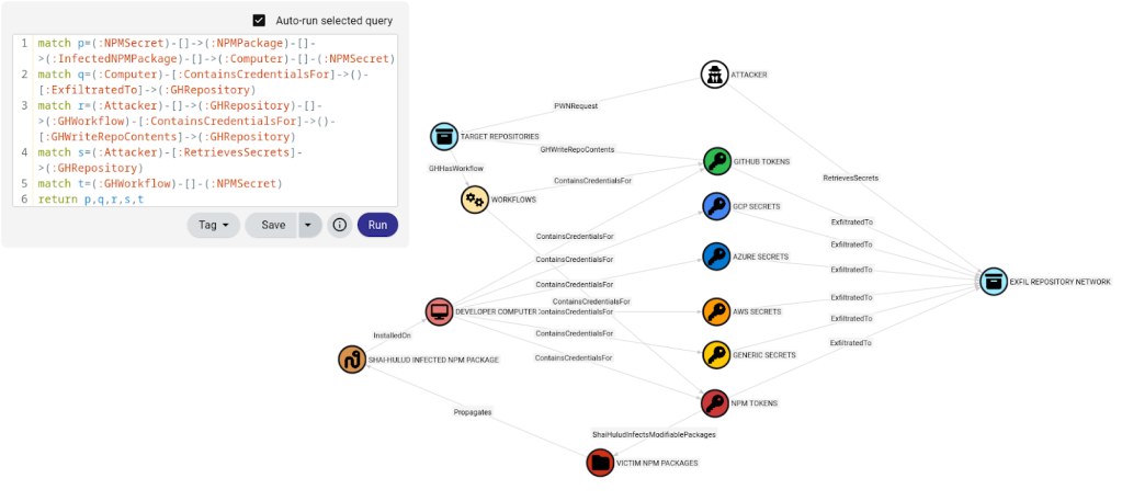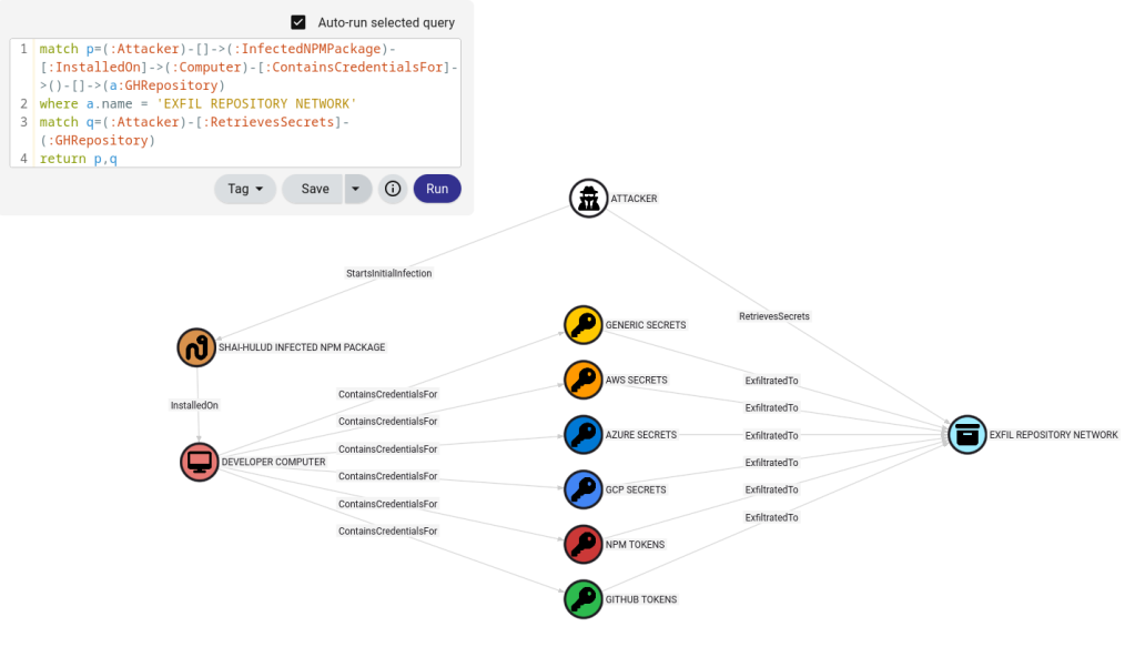 A recent supply chain attack, referred to as Shai-Hulud 2.0, involved an attacker using a worm to infect developer systems that contained credentials for various technology platforms. The underlying secrets were exfiltrated to a network of public GitHub repositories. Presumably, the attacker (or new attackers) retrieved these secrets. At a high level, this is depicted in the following graph.