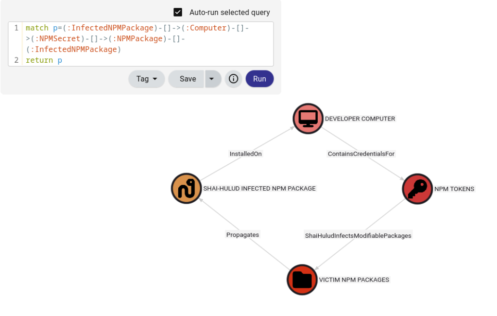 The attacker leveraged the exposed NPM token to infect writable NPM packages. These infected packages were propagated to other systems as the Shai-Hulud 2.0 worm. This gives us a high-level decomposition of the “StartsInitialInfection” edge in the graph below.