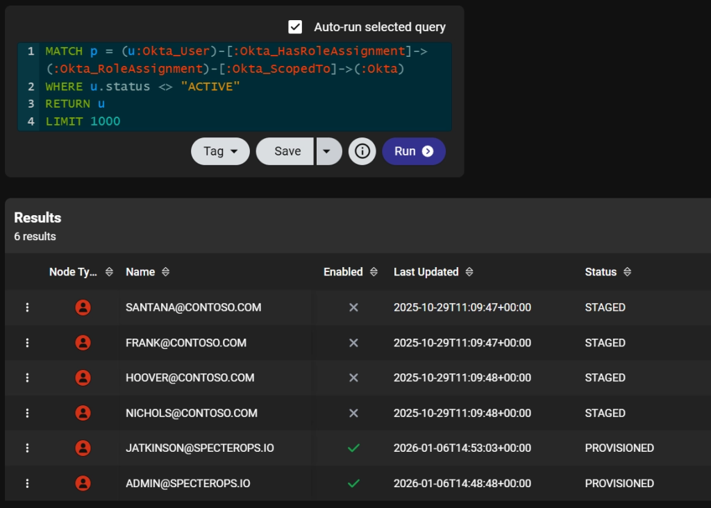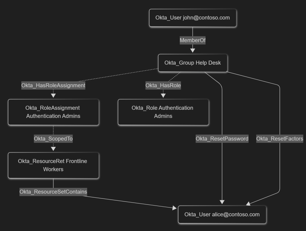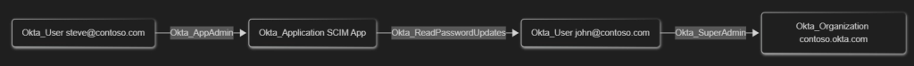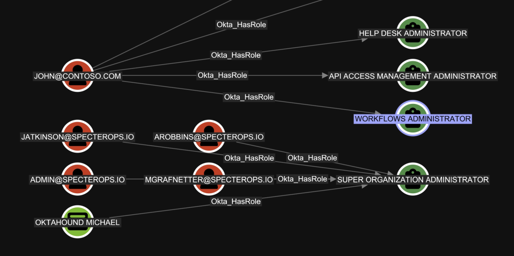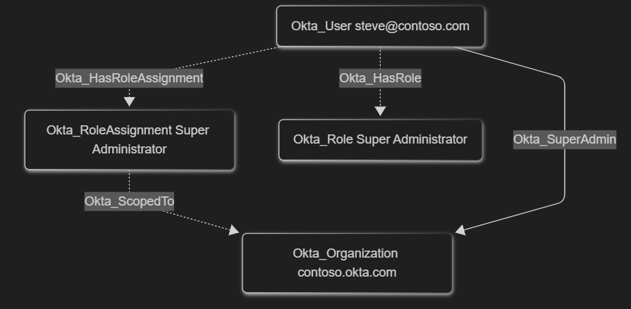 Each built-in Okta role assignment is modeled using a role-specific direct traversable edge, such as Okta_SuperAdmin or Okta_GroupAdmin, and indirect non-traversable Okta_HasRoleAssignment, Okta_ScopedTo, and Okta_HasRole edges.
