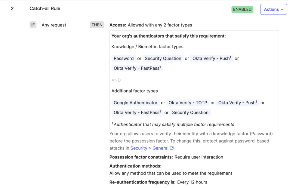 Having said that, Okta organizations seem to be secure by default. Multi-factor authentication (MFA) is enforced for all users and re-authentication is required for sensitive administrative tasks.